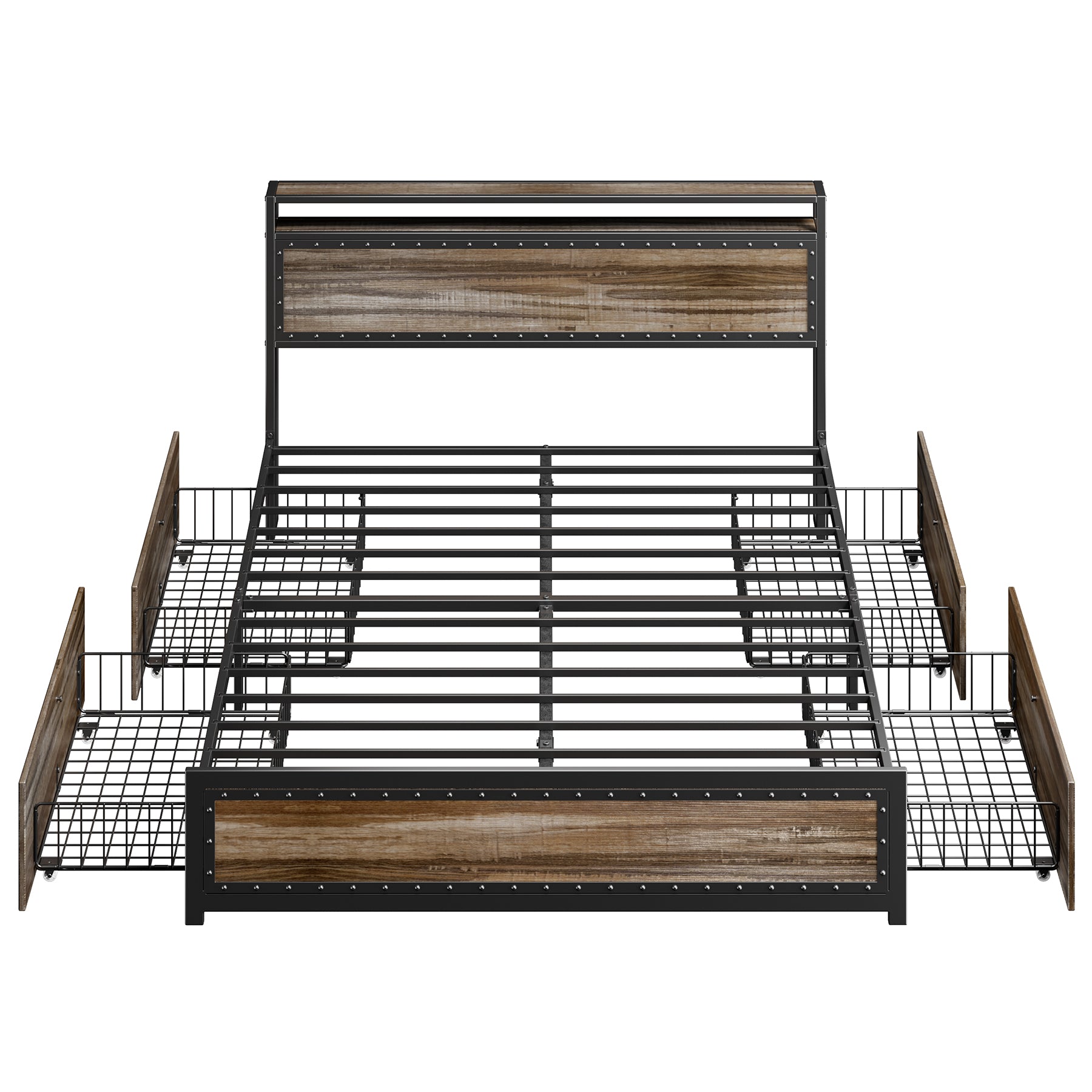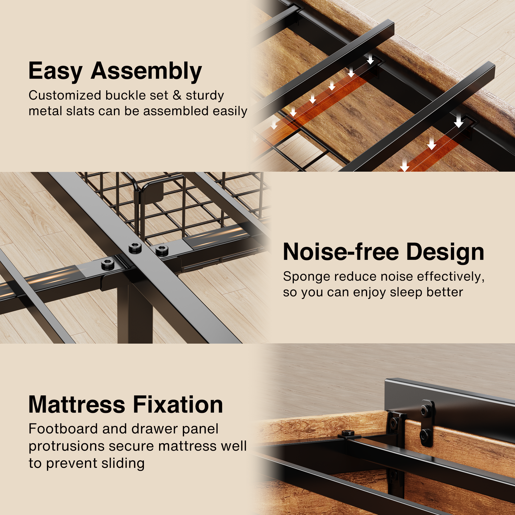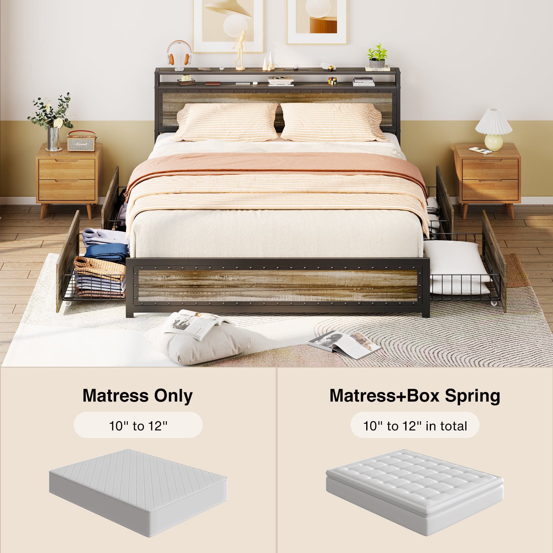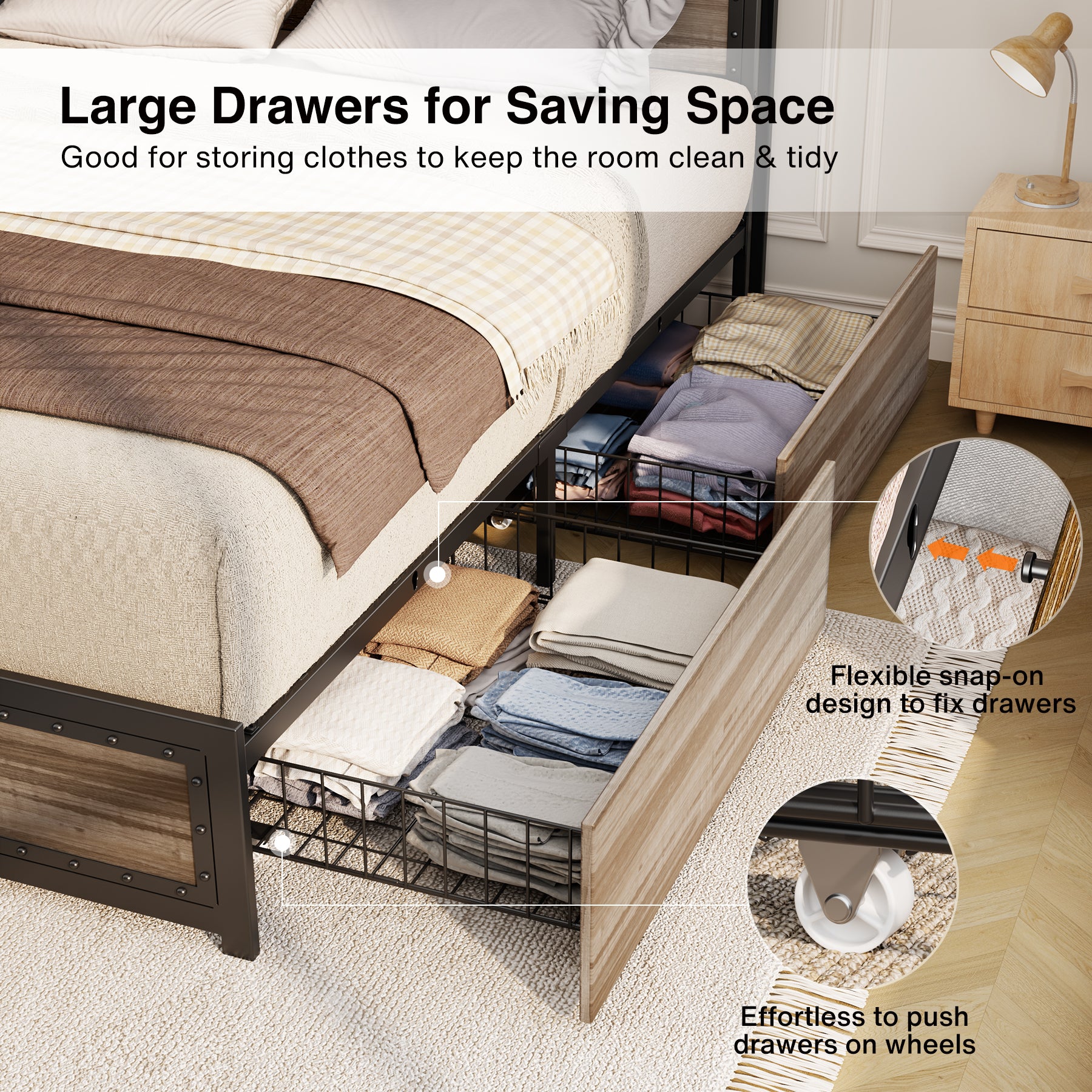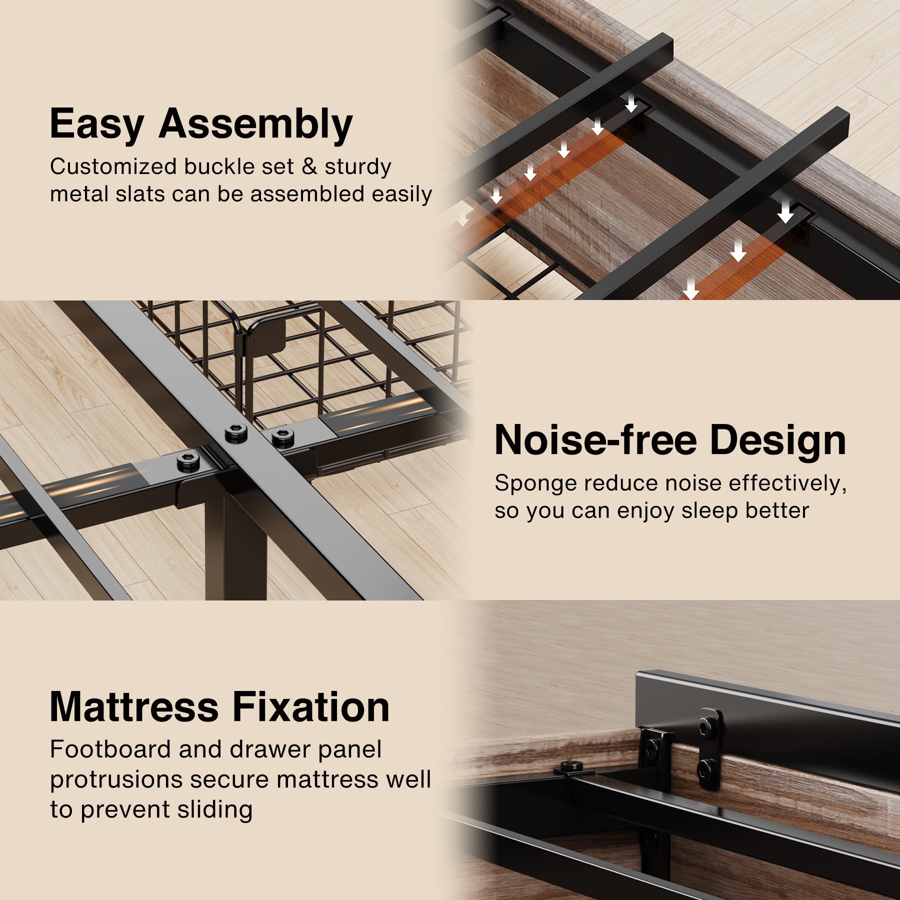 With 4 Storage Drawers and 2-Tier Headboard, Metal Platform Bed with Sturdy Steel Slats, No Box Spring Needed, Noise Free, Easy Assemble