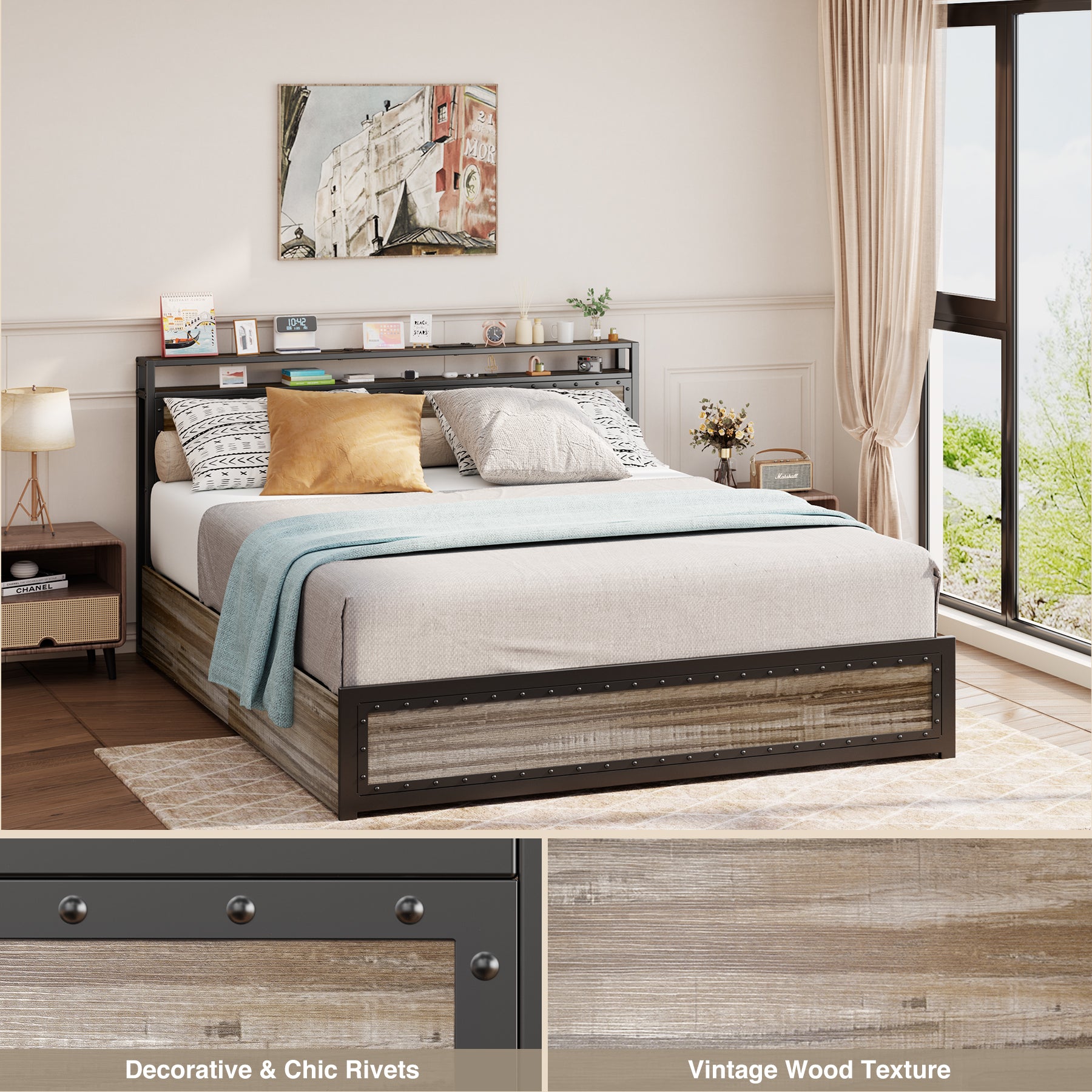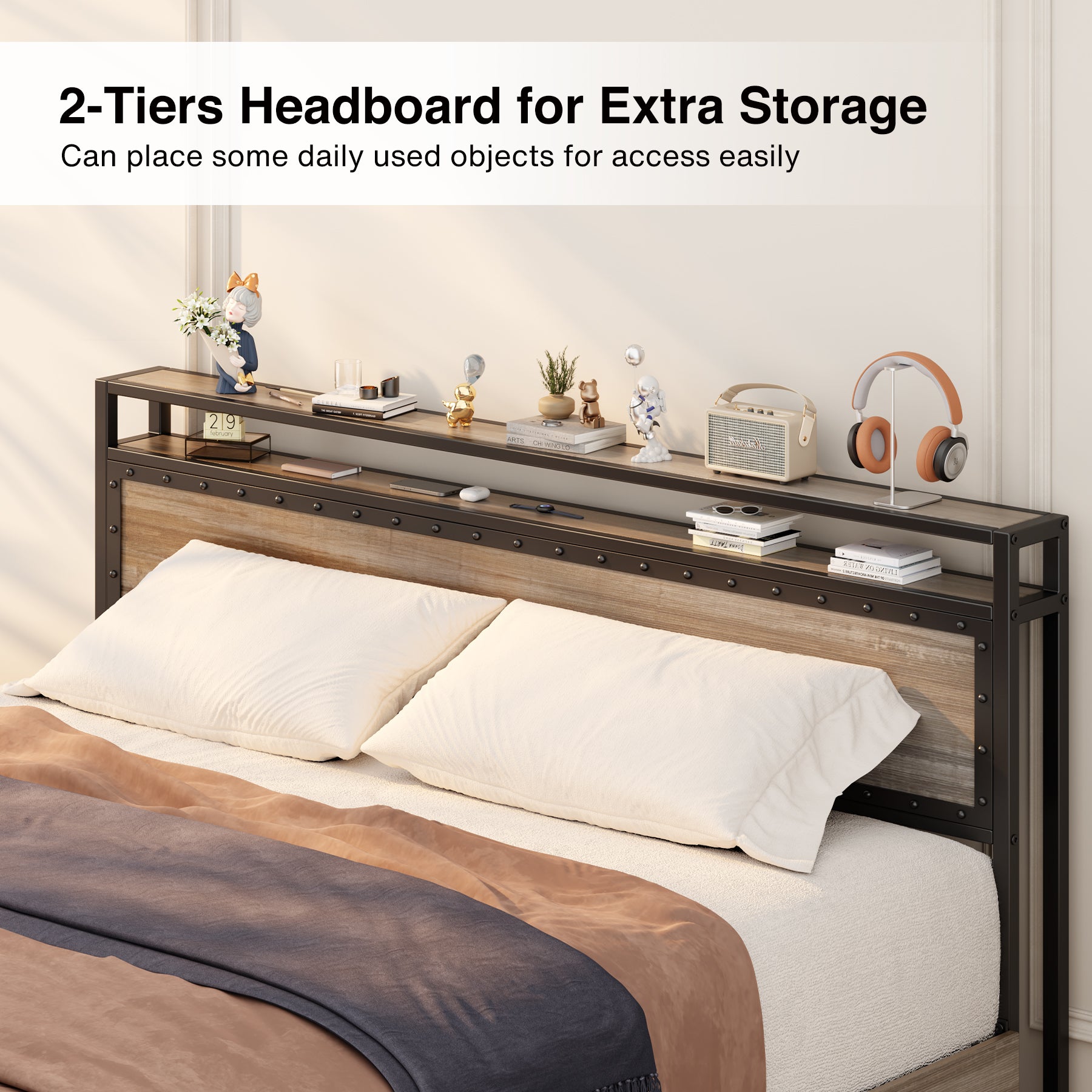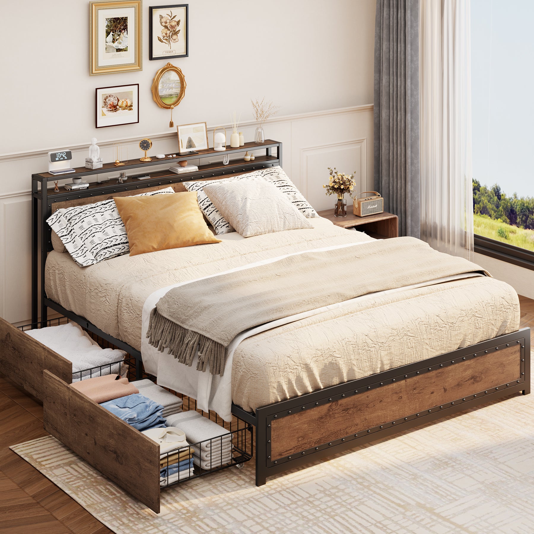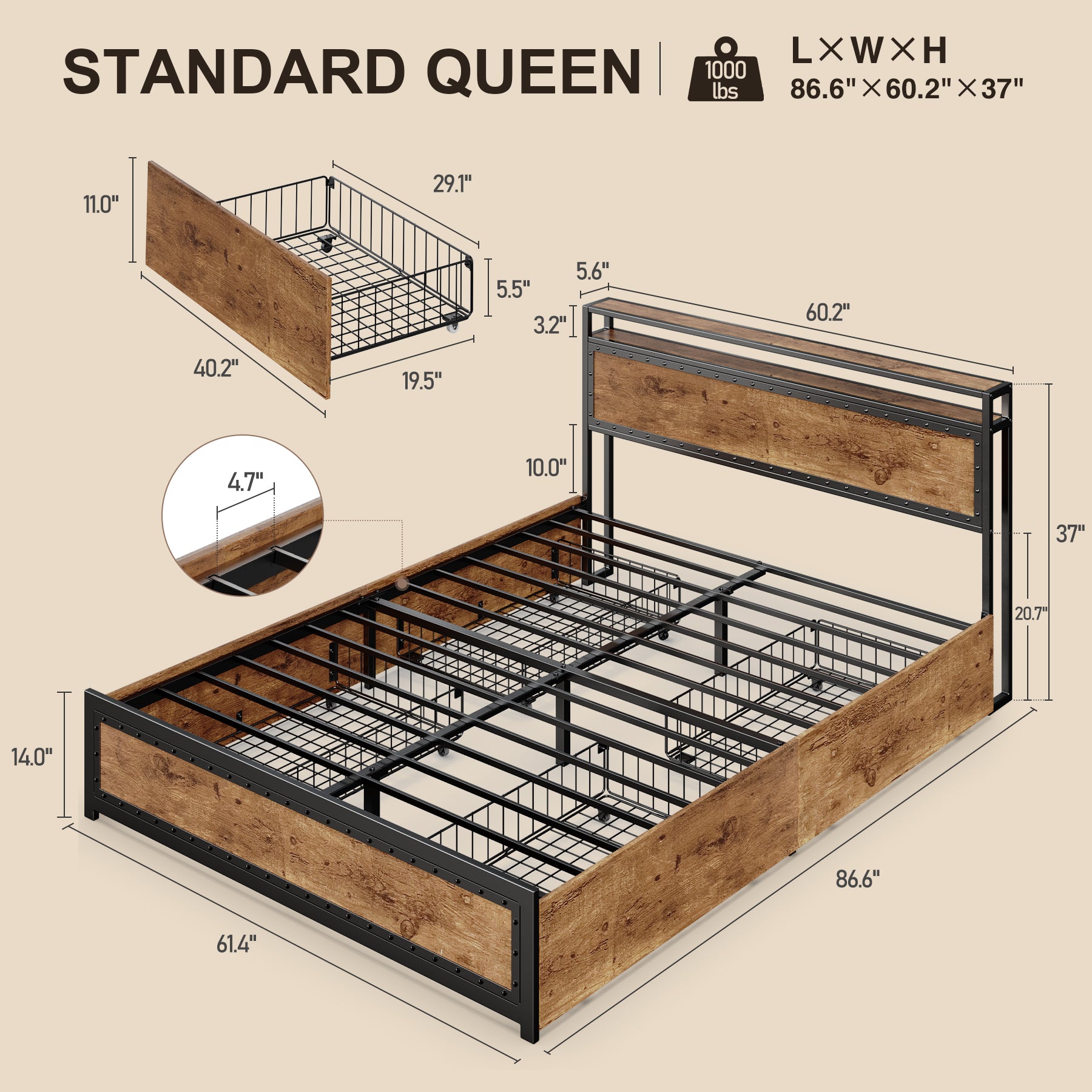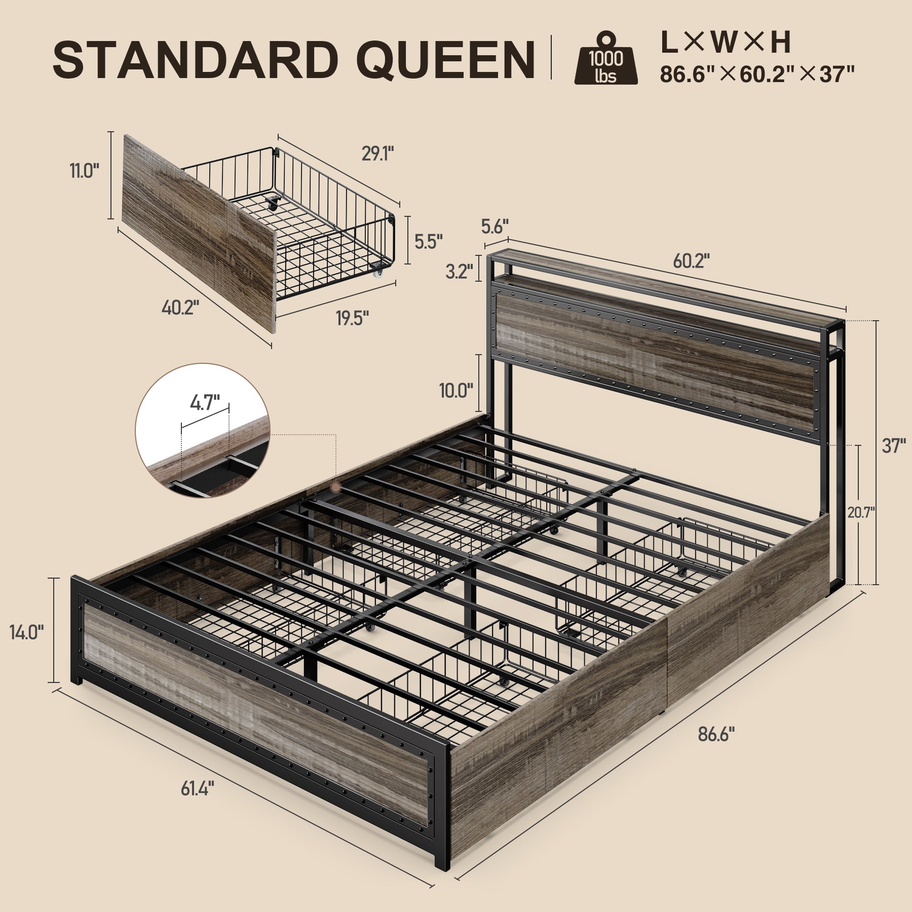 With 4 Storage Drawers and 2-Tier Headboard, Metal Platform Bed with Sturdy Steel Slats, No Box Spring Needed, Noise Free, Easy Assemble